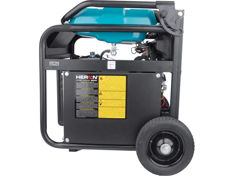 - A generátor védőkeretére szerelt nagy méretű, tömör gumikerekek és támasztóláb segítségével az áramfejlesztő könnyen szállítható még egyenetlen talajon is, a felborulás veszélye nélkül. A fogantyú lehajtható, így tárolás közben kisebb helyet foglal el.