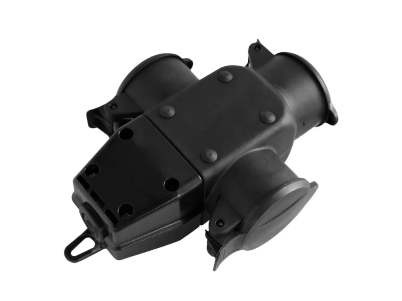 Commel hálózati gumis 3-as T elosztó, 3db földelt dugaszolóaljzattal. Csapófedeles, IP 44 szerelhető.