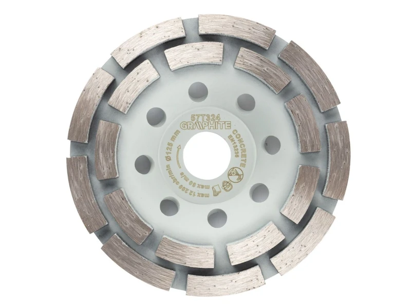 GRAPHITE 57T324 gyémántcsiszoló korong, 2 szegmens, 125 x 22,2 mm, száraz Az 57T324 két szegmenssel van felszerelve és száraz használatra tervezték. A készlethez redukciós gyűrűk tartoznak. A szegmenseket 4,5 mm magasság és 8 mm szélesség jellemzi. A GRAPHITE tárcsa maximális sebessége 12 200 fordulat/perc, ami 80 m/s-nak felel meg. A tárcsa beton, pórusbeton, tégla és kő csiszolásához készült. A tartozékban lévő lyukak javítják a hűtést munka közben, és hatékonyan távolítják el a port és a csiszolóanyagot. Ezáltal a csiszolás gyorsabbá és hatékonyabbá válik. A gyémántbevonatú szegmensek hatékony és eredményes csiszolást biztosítanak. Egyenletesen kopnak, ami szintén garantálja az egyenletes munkaminőséget. A szegmentált kialakítás javítja a hőelvezetést és megakadályozza a tárcsa túlmelegedését. A GRAPHITE terméke megfelel az EN 13236 szabvány követelményeinek.